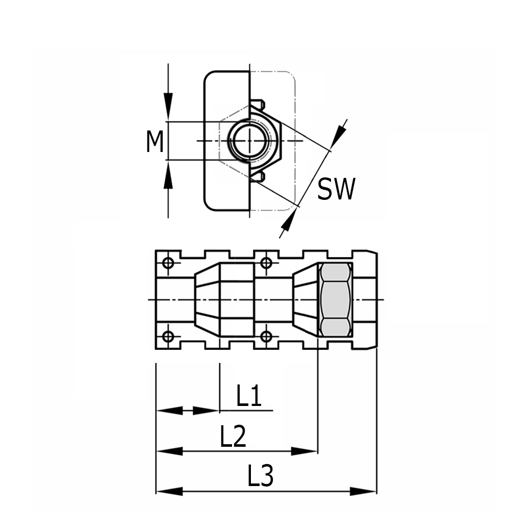 Dimension du tube=Dimension de tube extérieur, L1=Longeur jusqu'à écrou-1, L2=Longeur jusqu'à écrou-2, L3=Longeur totale, M=Dimension de filetage, SW=Sur plat, Type=Quantité écrous, Exécution=Épaisseur de paroi