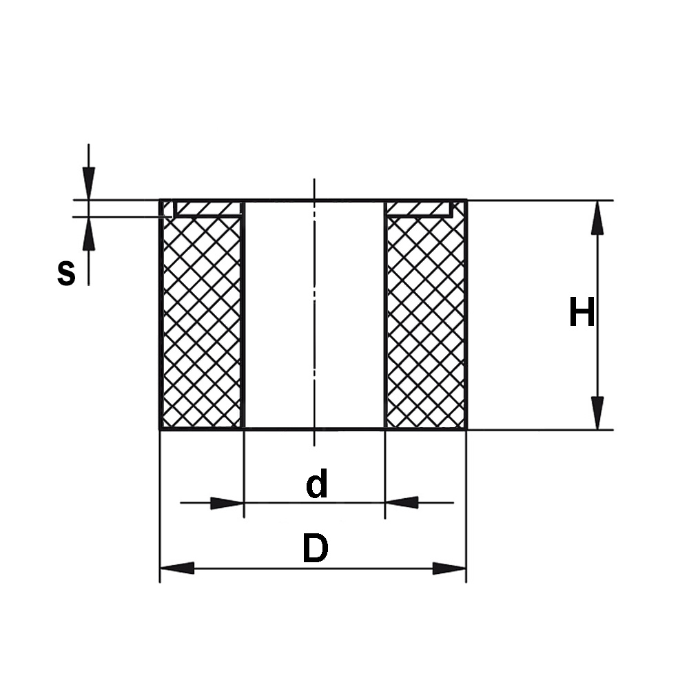 D=Ø-extérieur, D=Ø-perçage, H=Hauteur, Mat. A=Type de caoutchouc, Shore A °=Shore A dureté caoutchouc, s=Épaisseur métal