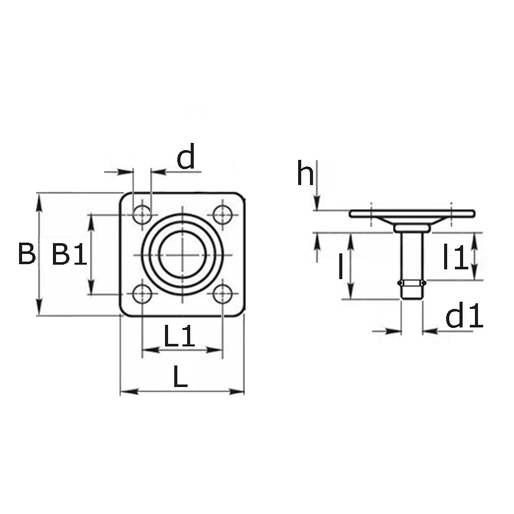 d1=Ø-tige, l1=Longeur jusqu'à rondelle élastique, l=Longueur de tige, LxB=Longeur x largeur tôle, L1xB1=Entraxe perçages