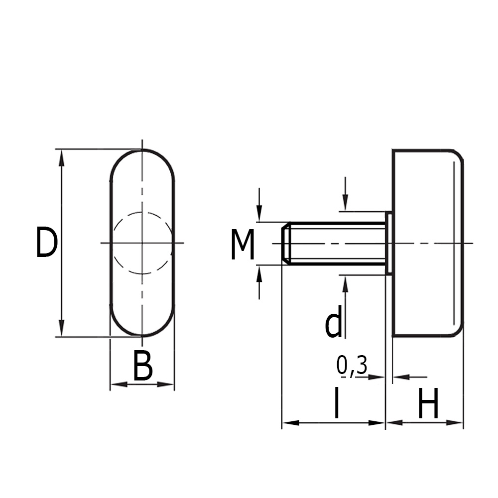 D=Longueur d'aile, D=Ø-collet, H=Hauteur, l=Longueur du filetage, M=Filetage