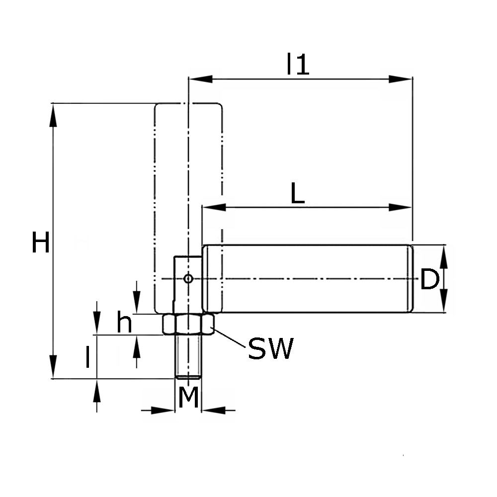 D=Ø-poignée grand, D=Hauteur écrou hexagonal, L=Longueur de la poignée, l=Longueur du filetage, M=Filetage, SW=Sur plat