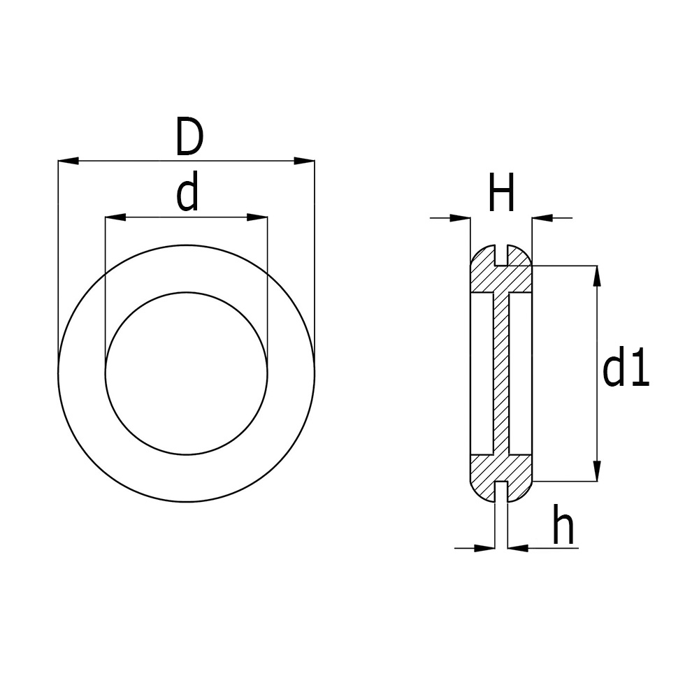 D=Ø-extérieur, d=Ø-trou de passage, d1(Perçage)=Ø-alésage de montage Ø, H=Hauteur, h=Épaisseur de plaque en mm