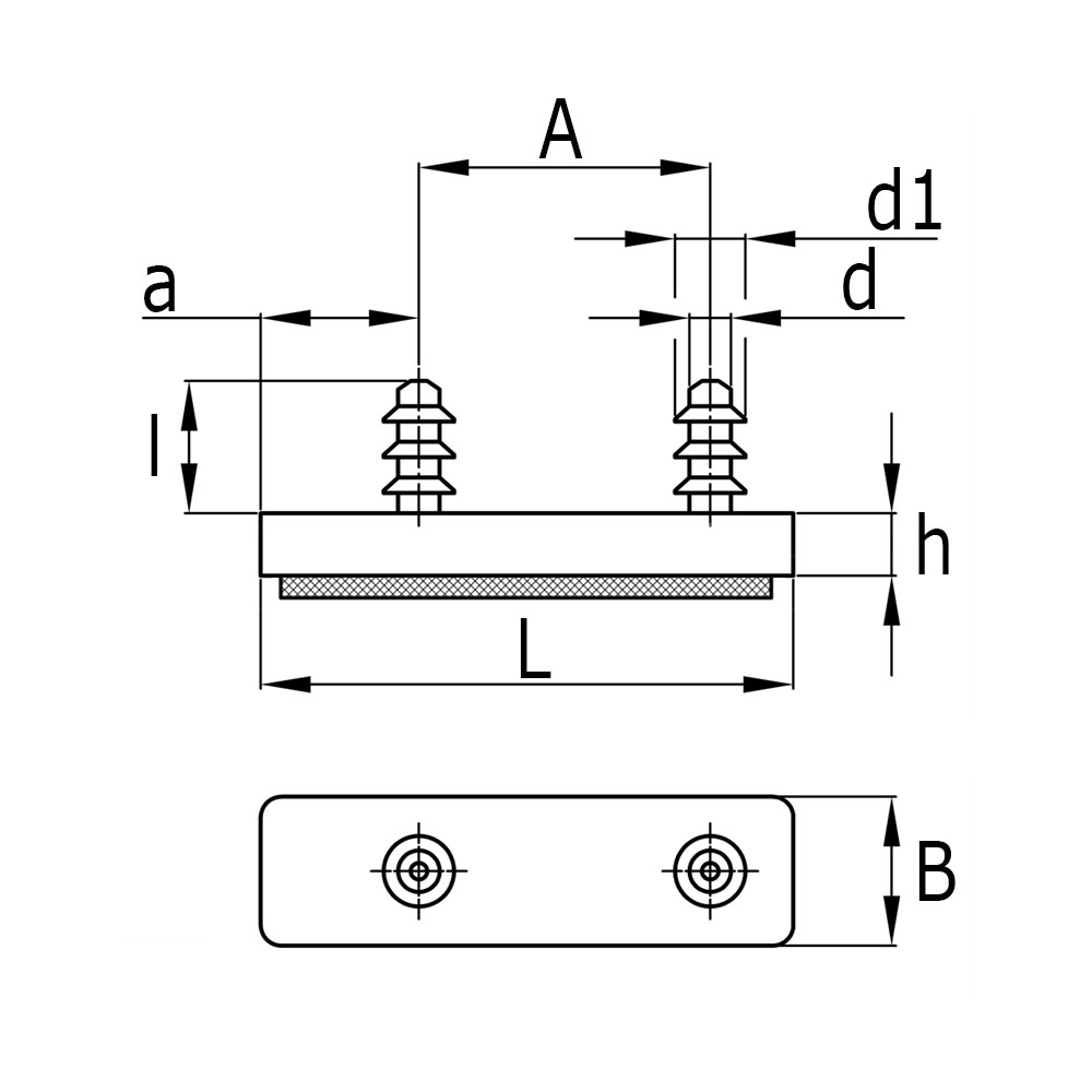 A=Distance tiges entraxe, a=Distance jusqu'à axe-tige, B=Largeur de plaque, Dimension du tube=Dimension de plaque, D=Ø-noyau de tige, D1=Ø-tige ailettes, h=Épaisseur de plaque, L=Longueur de plaque, l=Longueur de tige