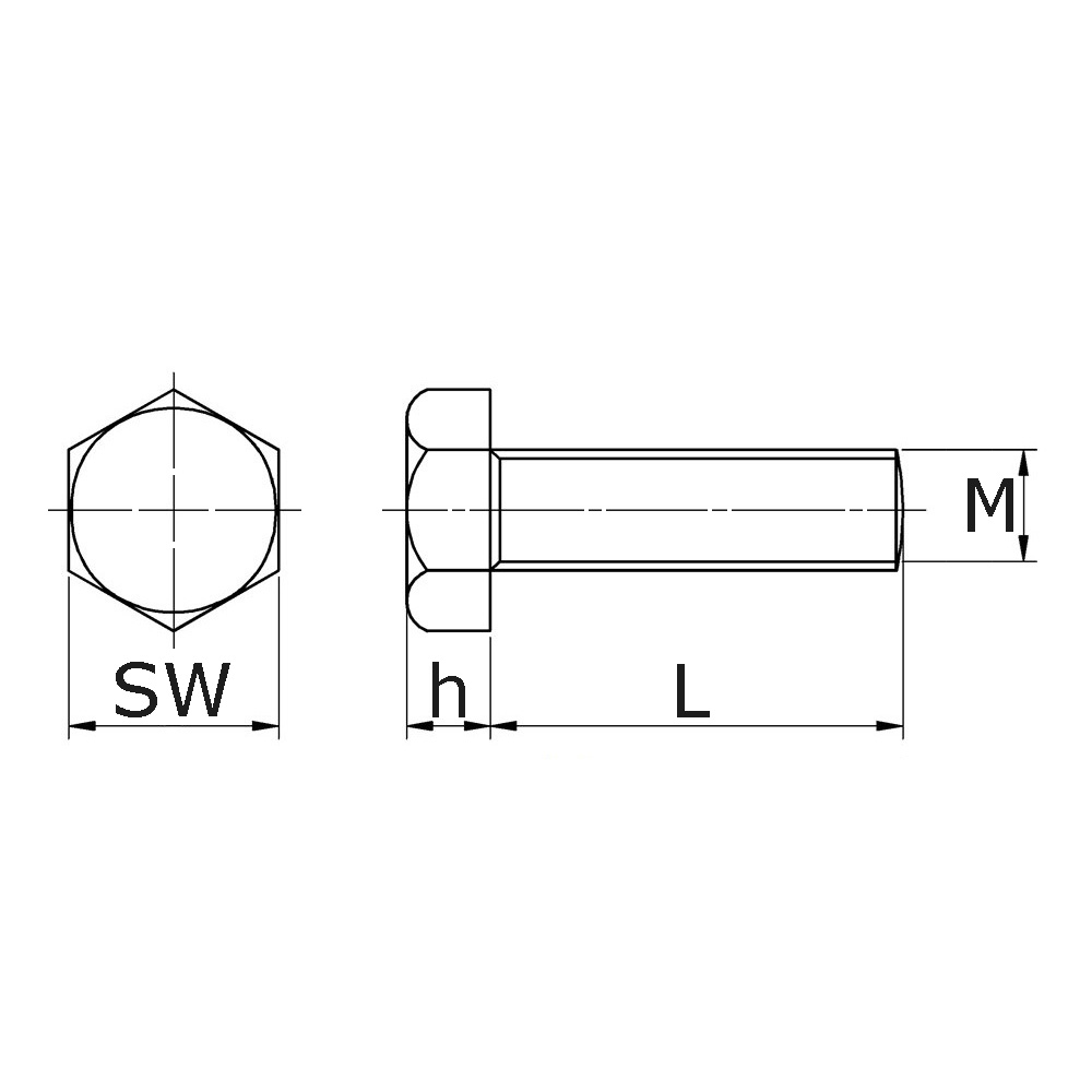 h=Hauteur de tête, l=Longueur du filetage, M=Filetage, SW=Sur plat en mm
