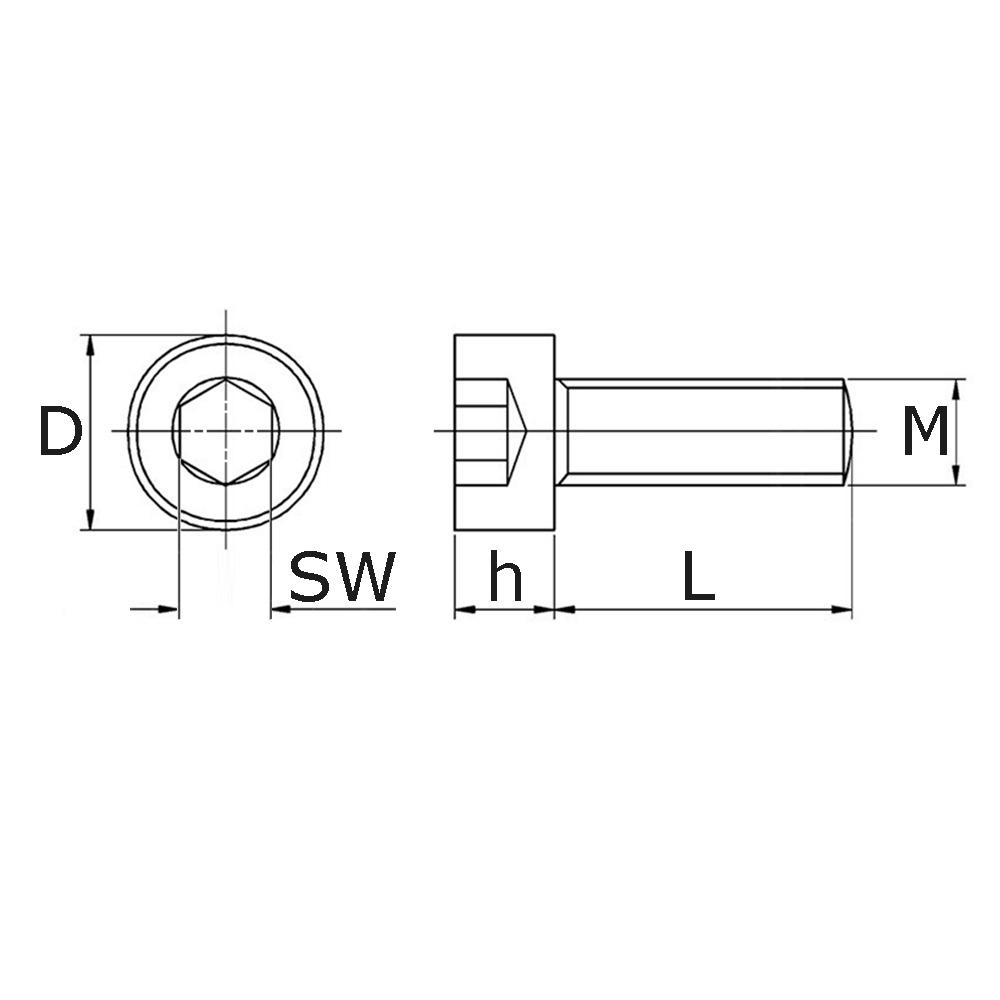 D=Ø-tête, h=Hauteur de tête, l=Longueur du filetage, M=Filetage, SW=Sur plat en mm