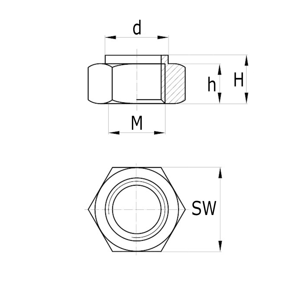 D=Ø-extérieur, H=Hauteur totale, h=Hauteur, M=Filetage, SW=Largeur de clé en mm