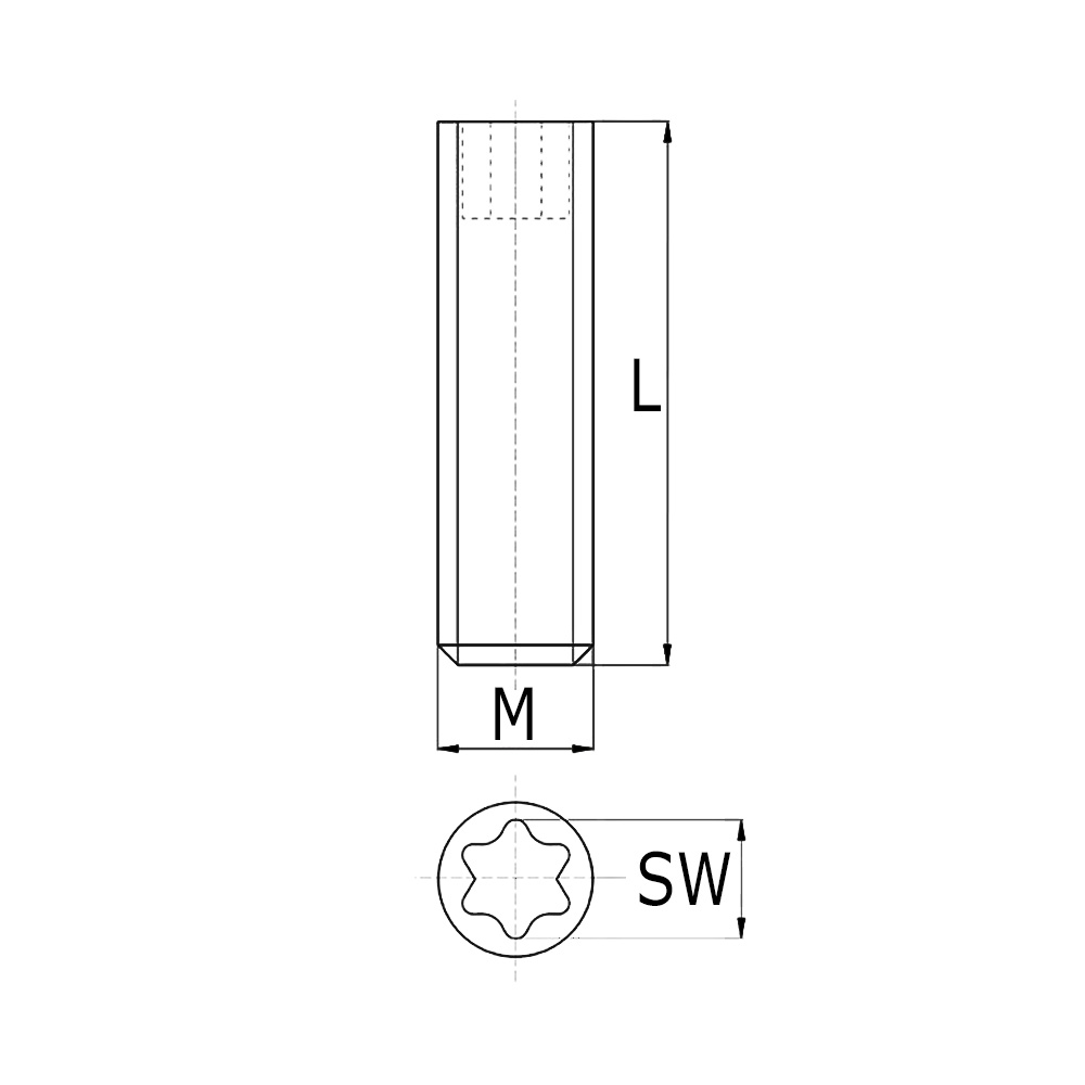 L=Longueur du filetage, M=Filetage, SW=Sur plat torx