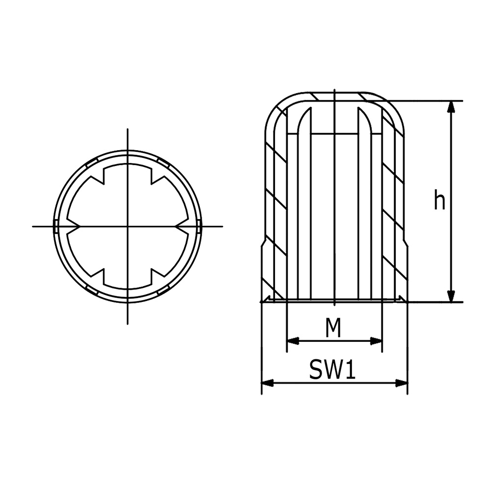 h=Hauteur intérieur totale , M=Dimension de filetage métrique, SW1=Sur plat