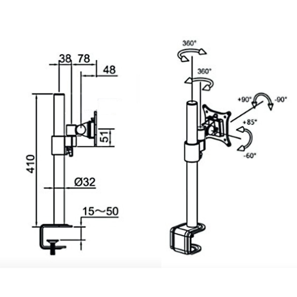Bras support écran B-Sky Eco3 Acier - support court unilatéral - bord de la feuille - pince passe-câble - 1 écran - Argent