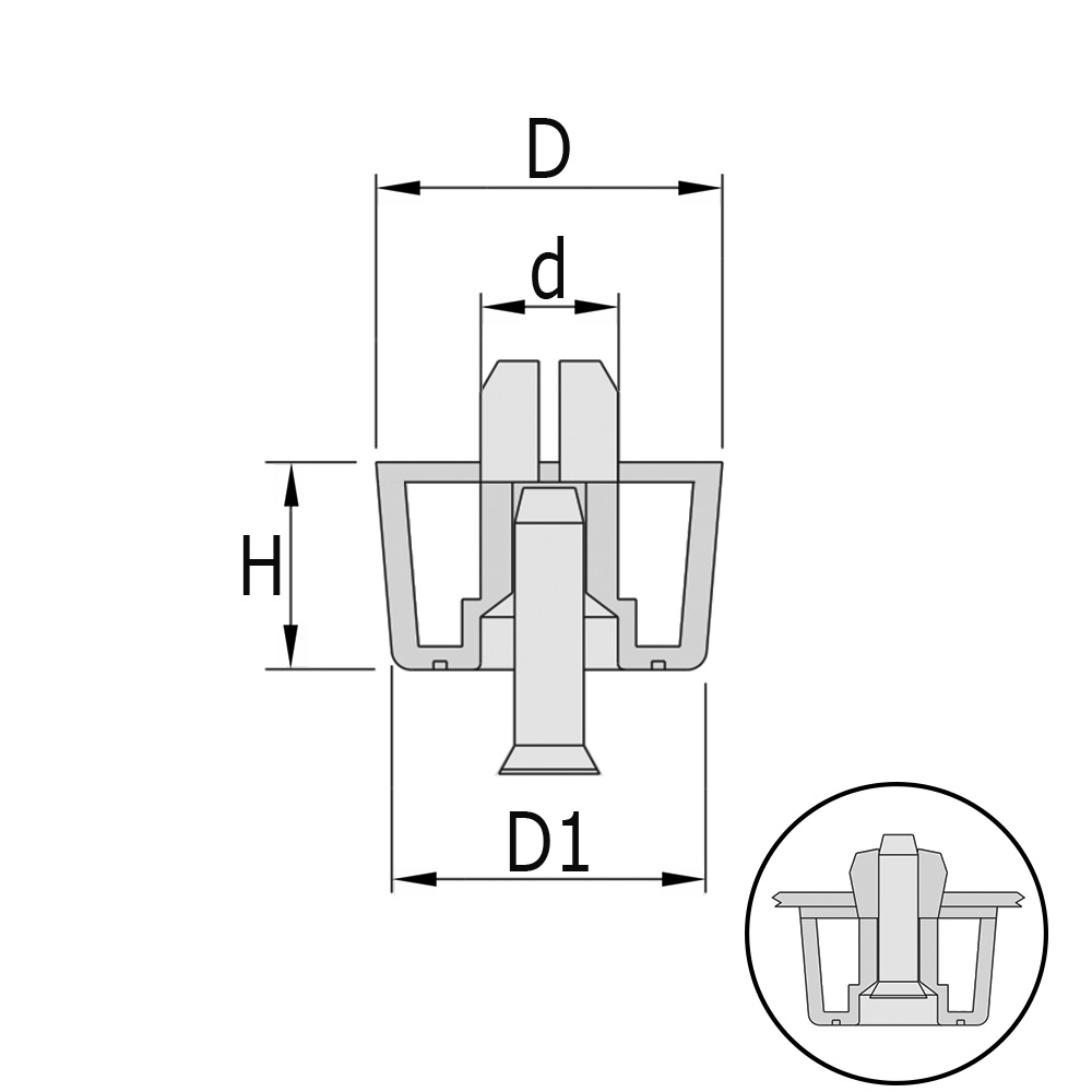 Alésage=Ø de montage du perçage, D=Ø-extérieur, D1=Ø-surface de glissement, d=Ø clou à expansion, H=hauteur, Épaisseur de tôle=Plage de serrage épaisseur de plaque (mm)