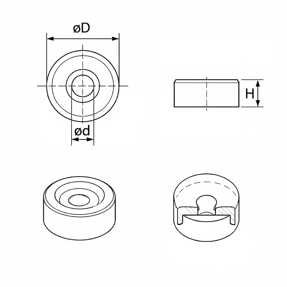 LégendeD=Ø-extérieur, d=Ø-intérieur pour fixation par vis, H=hauteur, Version=Ø-maximal du fil de tension