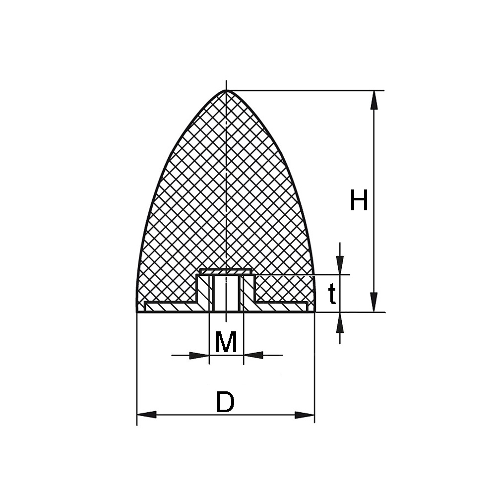D=Ø-grand, H=Hauteur, M=Filetage, Mat. A=Type de caoutchouc, Mat. B=Matériau pièces métalliques, Shore A °=Shore A dureté caoutchouc
