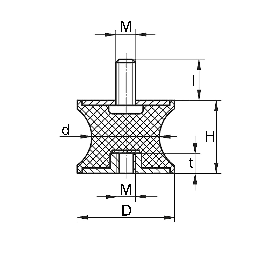 D=Ø-grand, D=Ø-étranglement, H=Hauteur, l=Longueur du filetage, M=Filetage, Mat. A=Type de caoutchouc, Mat. B=Matériau pièces métalliques, Shore A °=Shore A dureté caoutchouc, T=Profondeur du filetage