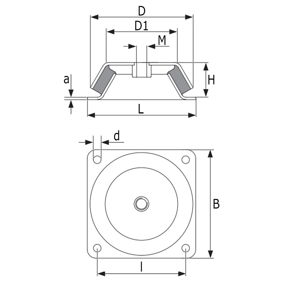 a=Plaatdikte, B=Breedte, d=Ø-boring, D=Ø-klokvormige kap, D1=Ø-plaat, H=Hoogte onbelast, L=Lengte, l=Hart op Hart afstand boringen, Mat. A=Rubbersoort, N=Maximale statische belastbaarheid in Newton, Shore A °=Shore A hardheid rubber
