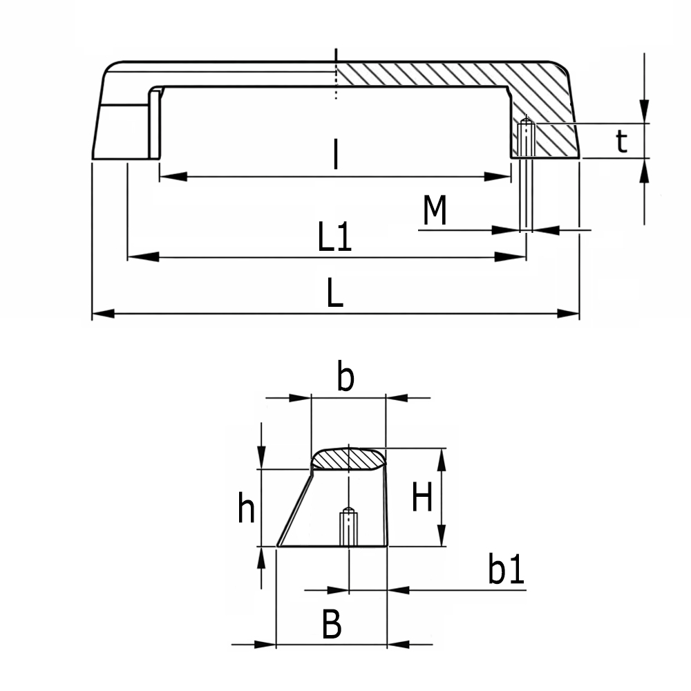 B=Largeur, b=Largeur, H=Hauteur, h=Hauteur, L=Longueur, L1=Entraxe des douille filetés, l=Longueur, M=Taraudage métrique, t=profondeur du filetage