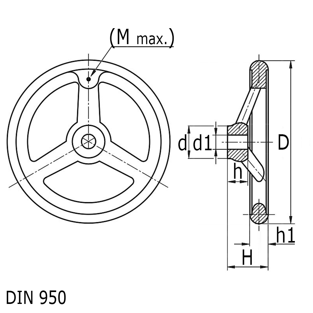 Perçage =Diamètre de perçage, D=Ø-jante, D=Ø-moyeu, Din=Din exécution, H=Hauteur totale , h=Hauteur de moyeu, h1=Hauteur jante, M=Dimension de filetage pour manivelle maximale (position seulement pré-centré)