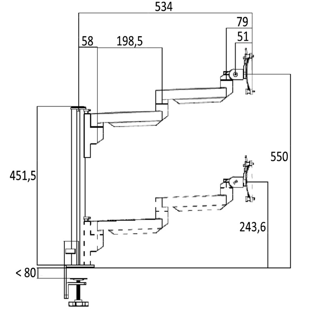 - Deux écrans droits statiques, chacun d'une longueur de 240 mm: trois points de pivot entre le connecteur VESA et le connecteur/la glissière