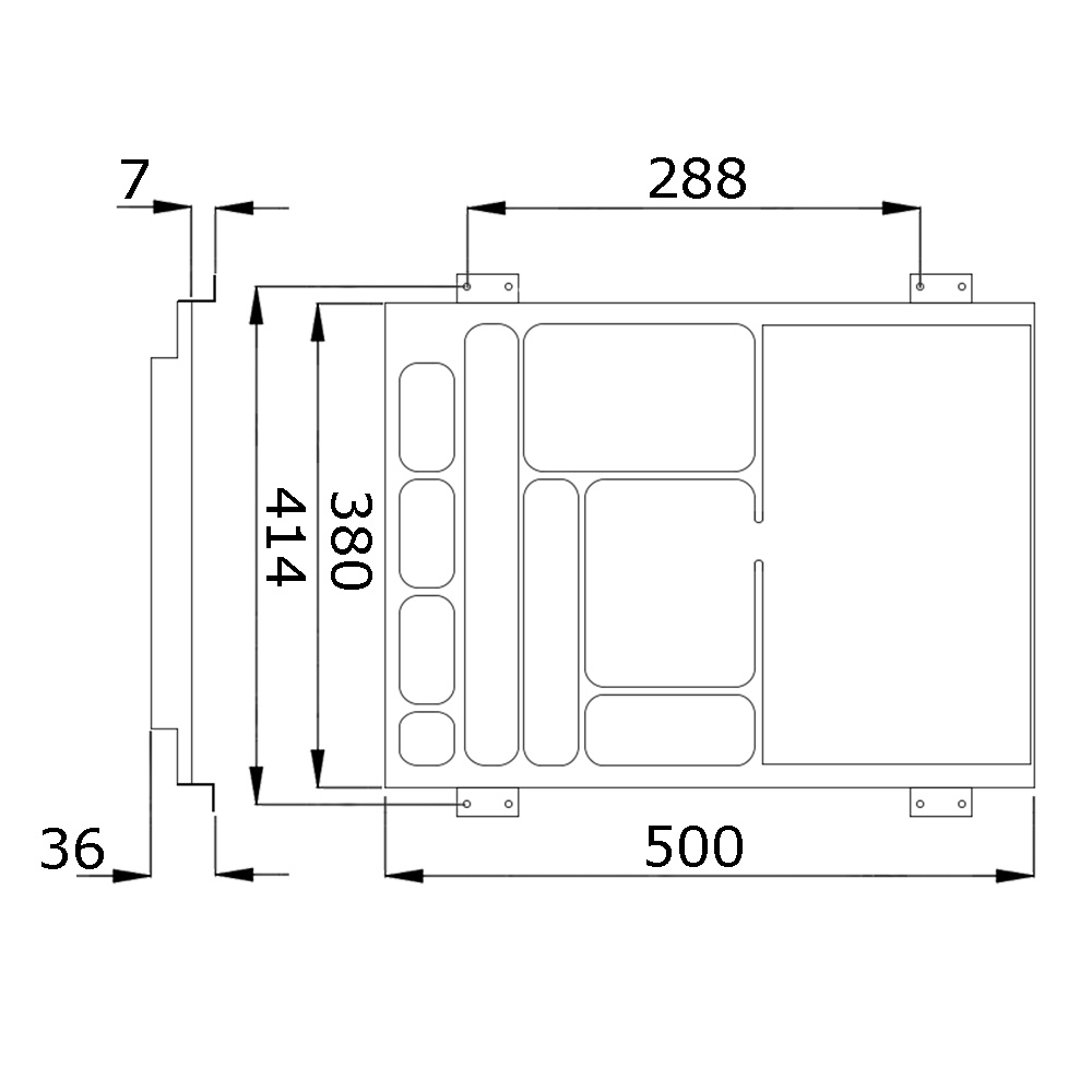 - Le tiroir contient 9 compartiments, dont 3 compartiments de grande dimension, 3 compartiments moyens longs et 3 petits compartiments