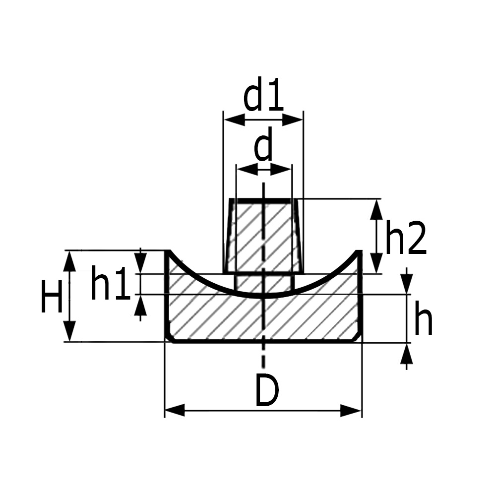 Perçage =Ø-trou de montage, Dimension du tube=Ø-tube extérieur, D=Ø-pied, D=Ø-tige petit, D1=Ø-tige grand, H=Hauteur, h=Hauteur de pied, h1=Hauteur tige Ø-petit, h2=Hauteur tige, Épaisseur de plaque=Épaisseur de plaque maximale