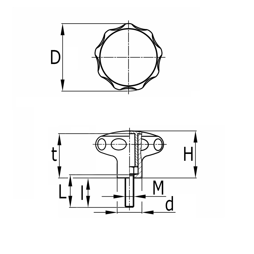 D=Ø-bouton, D=Ø-tige, H=Hauteur totale , l=Longueur du filetage utilisable , M=Filetage