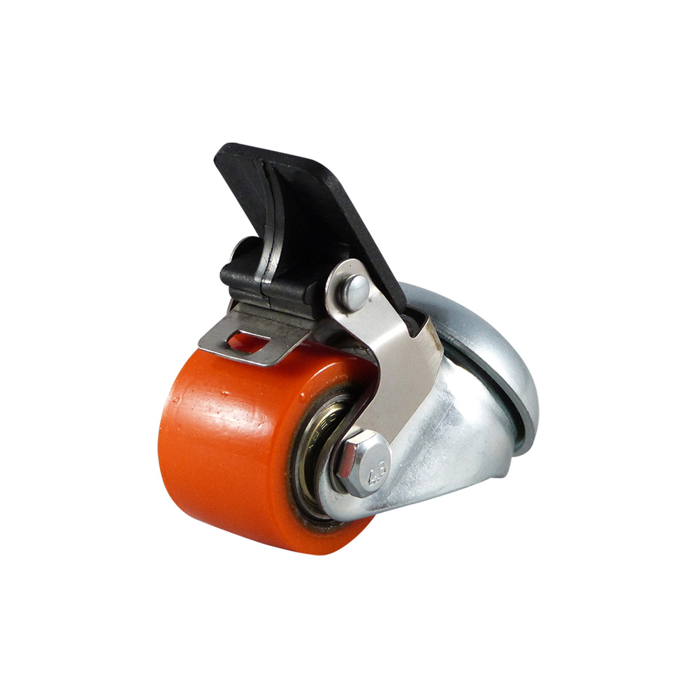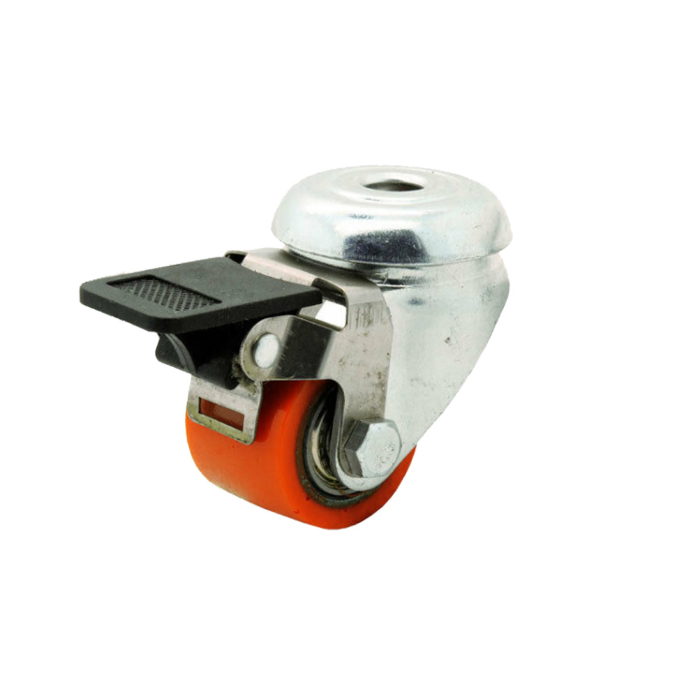 Roulette appareil pivotante mini avec frein Ø50mm Acier - bande de roulement PU / TPU - forte charge - roulement à billes - trou de boulon Ø11mm - Acier