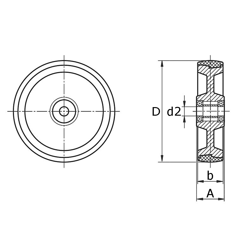 A=Largeur du moyeu, B=Largeur de jante, D=Ø-roue, D2=Ø-alésage, K=Capacité de charge statique max. en kg à 4 km/h
