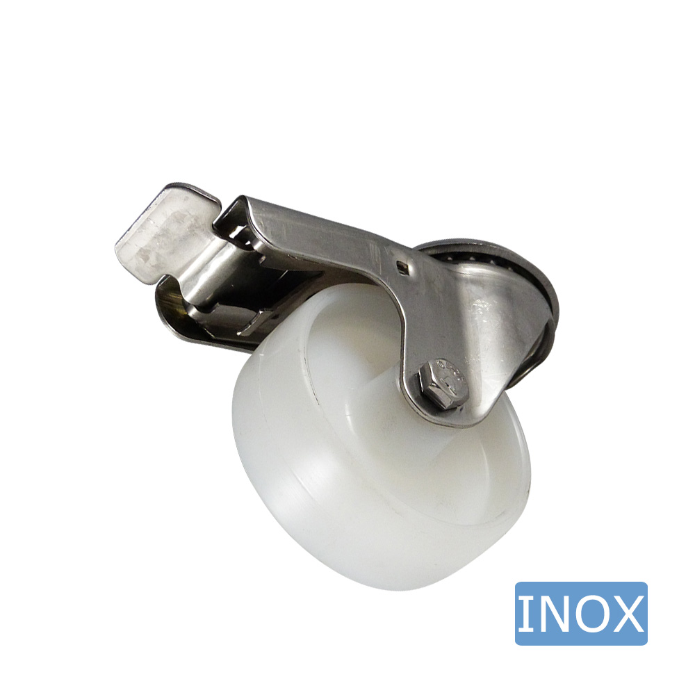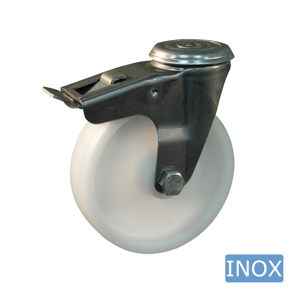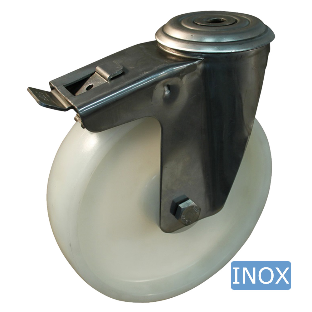 Roulette pivotante avec frein Ø150mm PA - bande de roulement bleu plastique - roulement lisse - trou de boulon Ø16mm - Inox