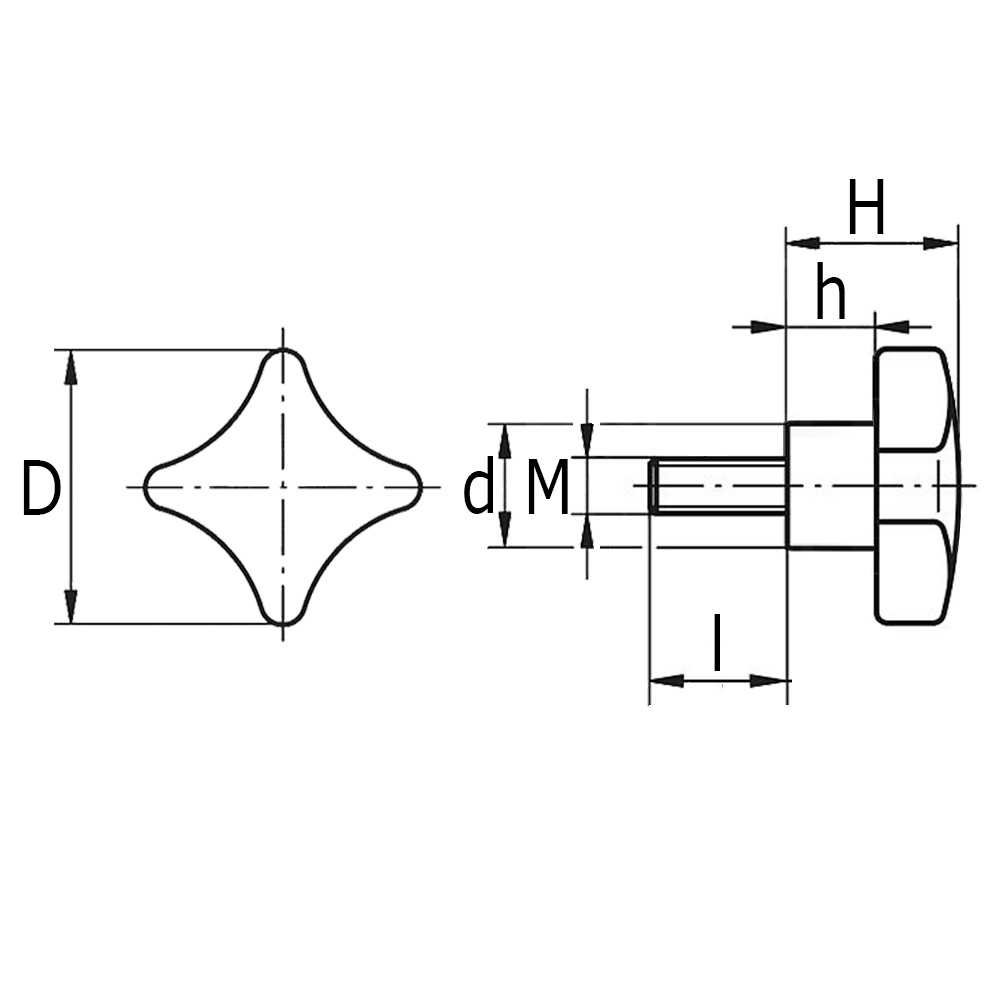 D=Ø-bouton, d=Ø-collerette, h=Hauteur, l=Longueur du filetage, M=Filetage