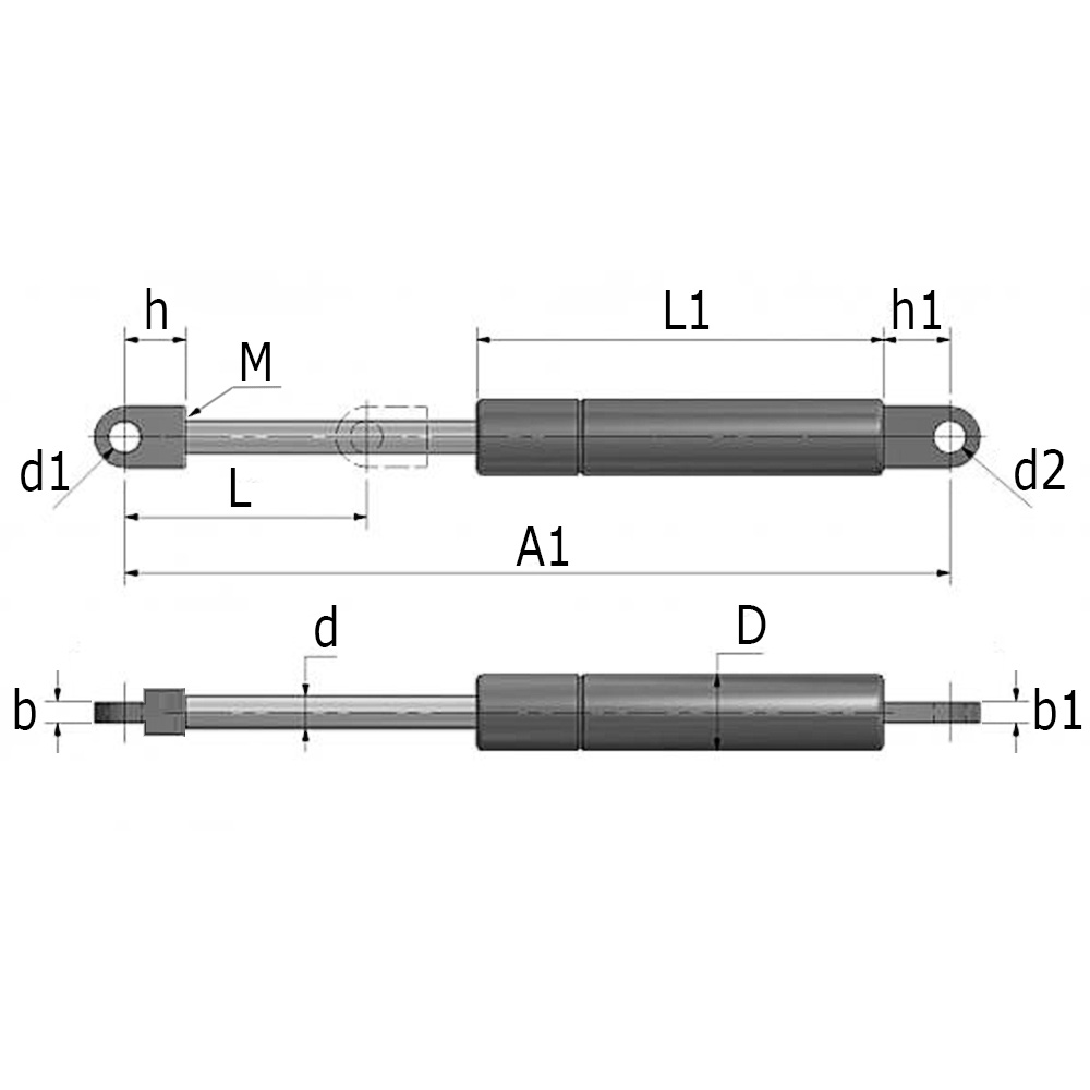 Vérin à gaz Ø8-19mm - M8 - longeur course 200mm - longueur totale 500mm - 350 Newton