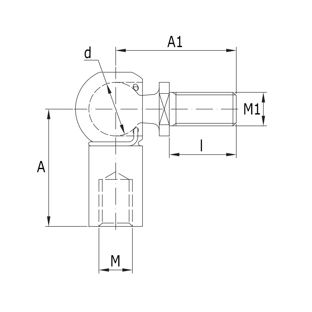 A=Longueur d'installation, A1=Longueur du boulon, d=Ø de la bille, l=Longueur du filetage, M=Taille du taraudage, M1=Taille du filetage, N=Capacité axiale max. en Newton, Type=Description de type standardisée