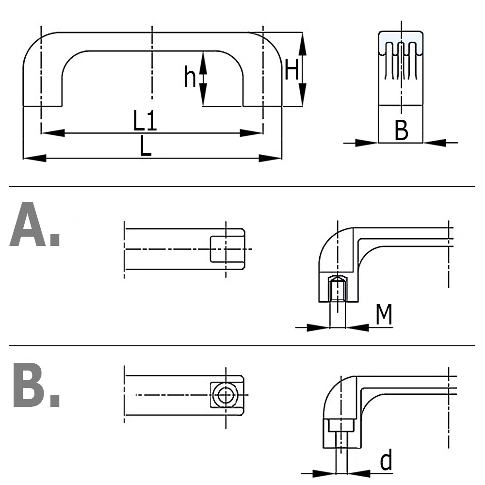 B=Largeur, B=Ø-perçage, H=Hauteur, h=Hauteur, L=Longeur, L1=Perçage ou douille entraxe, M=Filetage douille filetée, Type=Exécution