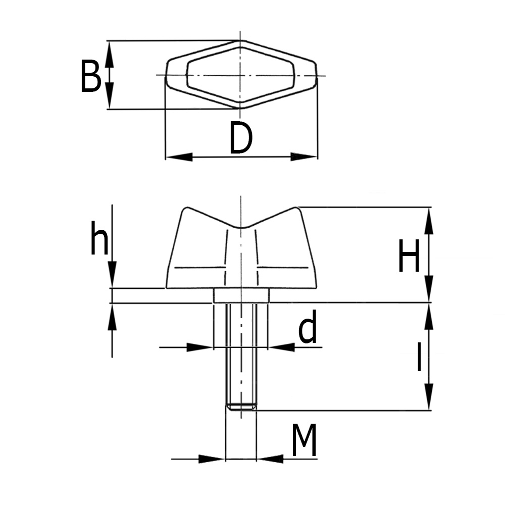 D=Longueur du bouton, D=Ø-bride, H=Hauteur, l=Longueur du filetage, M=Filetage
