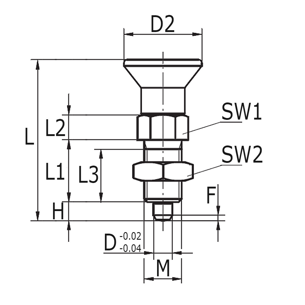 D=Ø-tige, D2=Ø-bouton, F=Hauteur facette du tige, H=Longueur de tige, L=Longeur totale, L1=Longeur, L2=Hauteur hexagonal collet, L3=Longeur filetage, M=Dimension de filetage (métrique fin), SW1=Sur plat collet, SW2=Sur plat écrou hexagonal