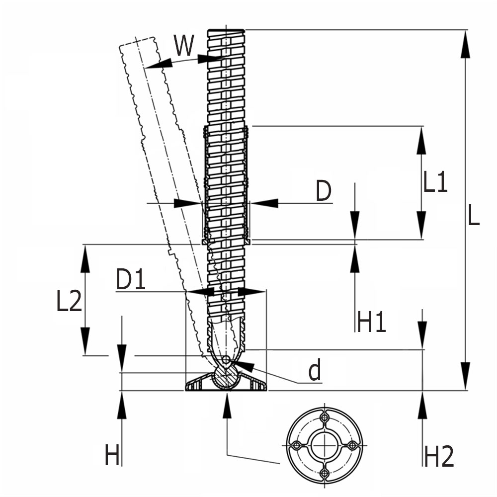 Dimension du tube=Dimensions des tubes extérieur , D=Ø-collet, D1=Ø-pied, H=Hauteur de pied, H1=Épaisseur du collet, K=Capacité de charge statique max. en kg, L=Longeur totale, L1=Longueur de tige, L2=Plage de réglage, SW=Sur plat en mm, Exécution=Épaisseur de paroi, W=Angle de montage en °