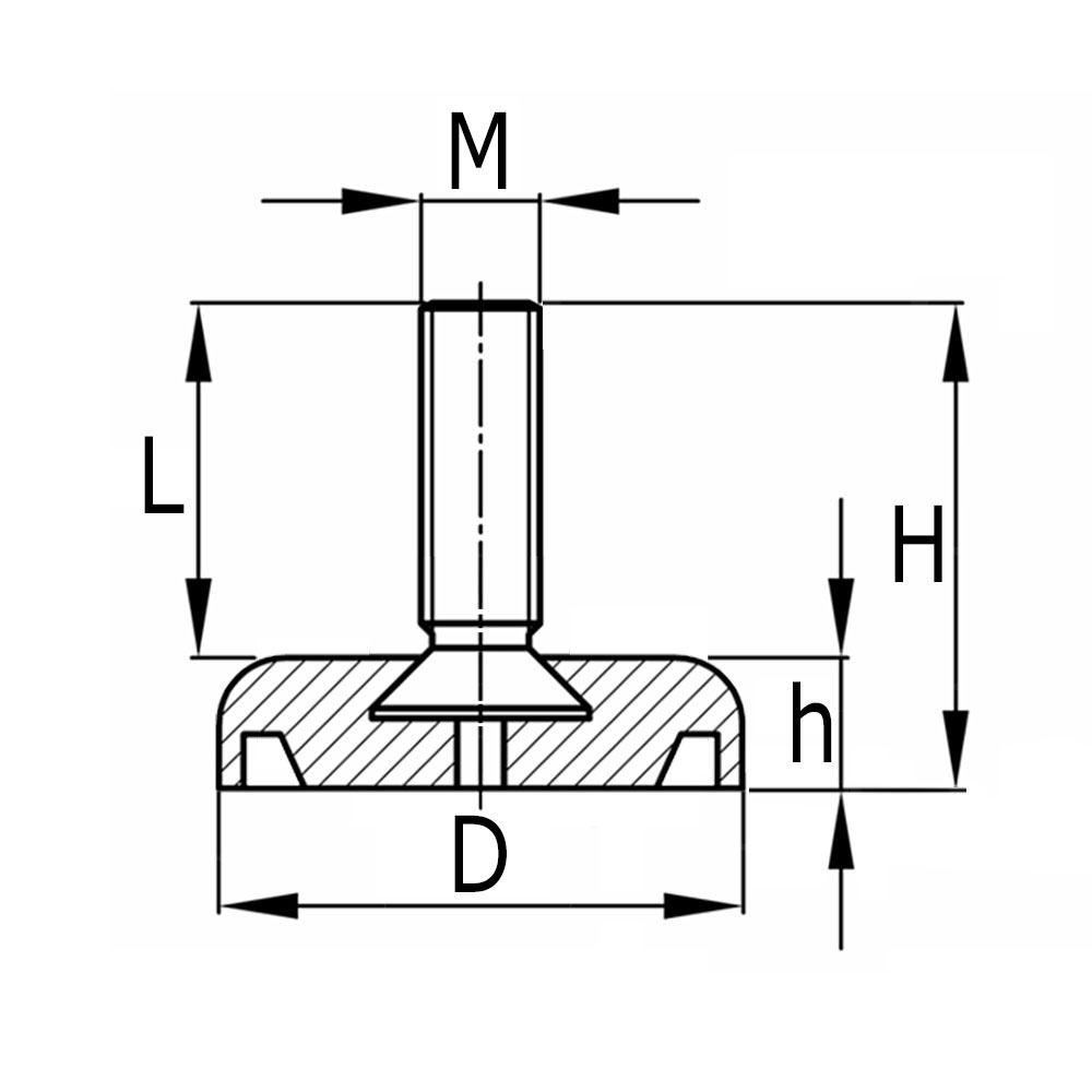 D=Ø-pied, H=Hauteur de pied, L=Longueur du filetage utilisable, M=Dimension de boulon