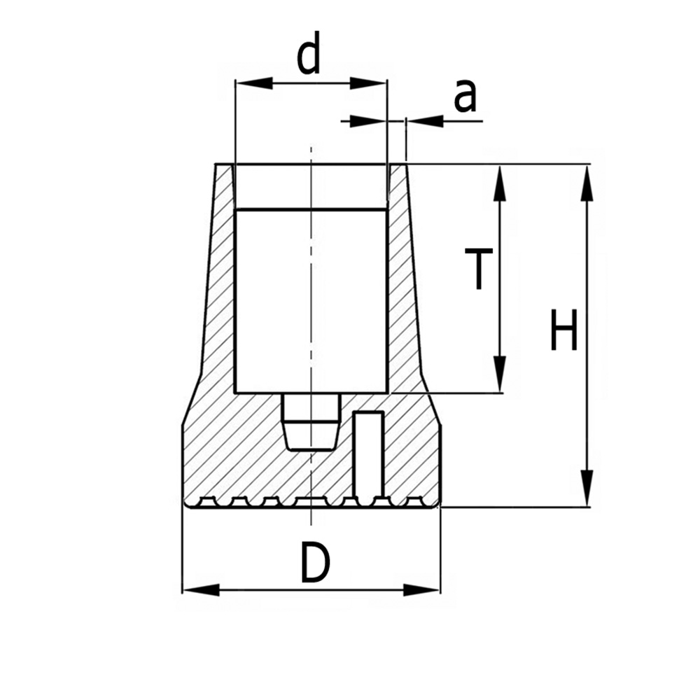a=Épaisseur de paroi embout, Dimension du tube=Ø-tube extérieur, D=Ø-pied, D=Ø-intérieur, H=Hauteur, T=Profondeur