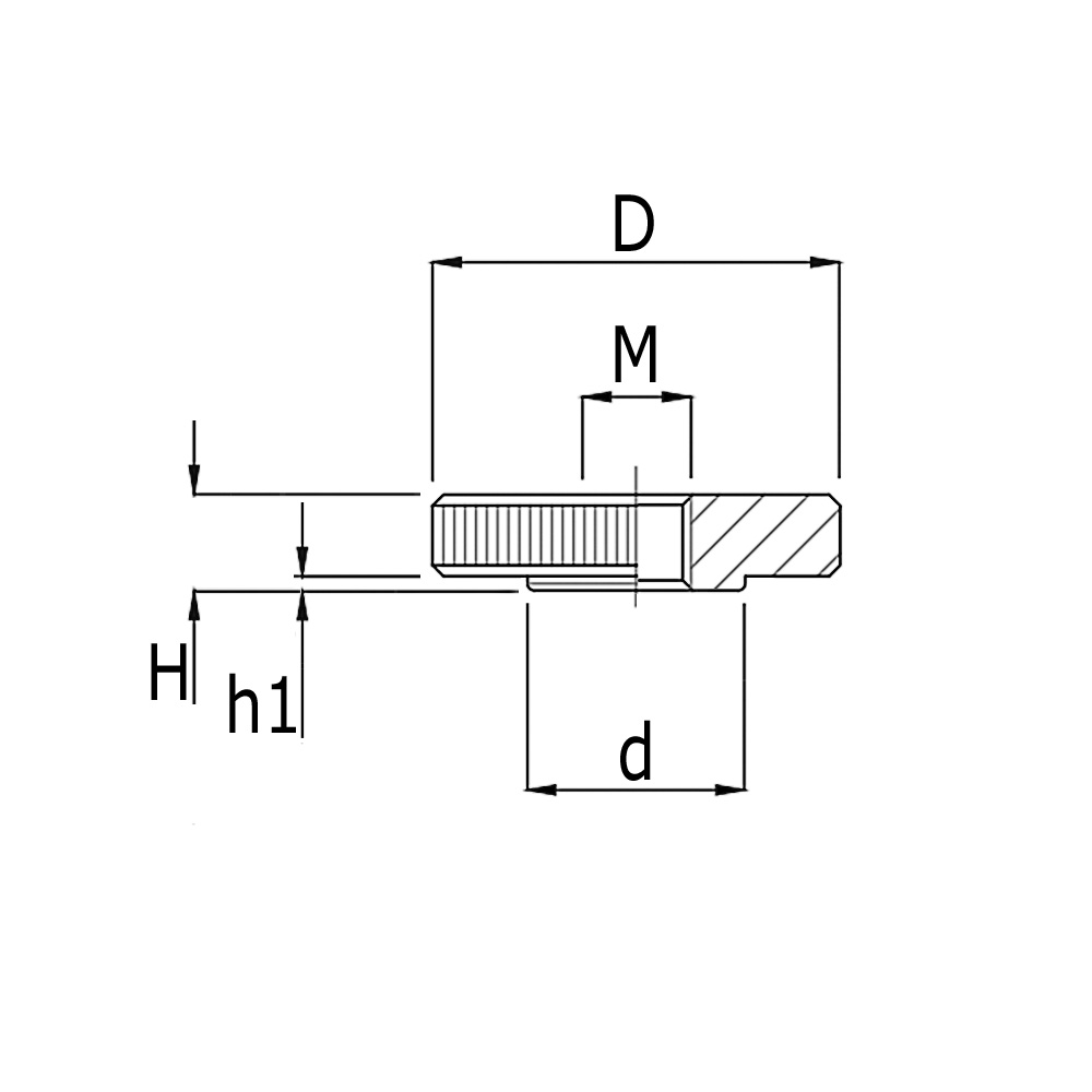 D=Ø-bouton, D=Ø-épaulement, H=Hauteur du bouton, H1=Hauteur totale , h1=Hauteur d'épaulement, M=Filetage
