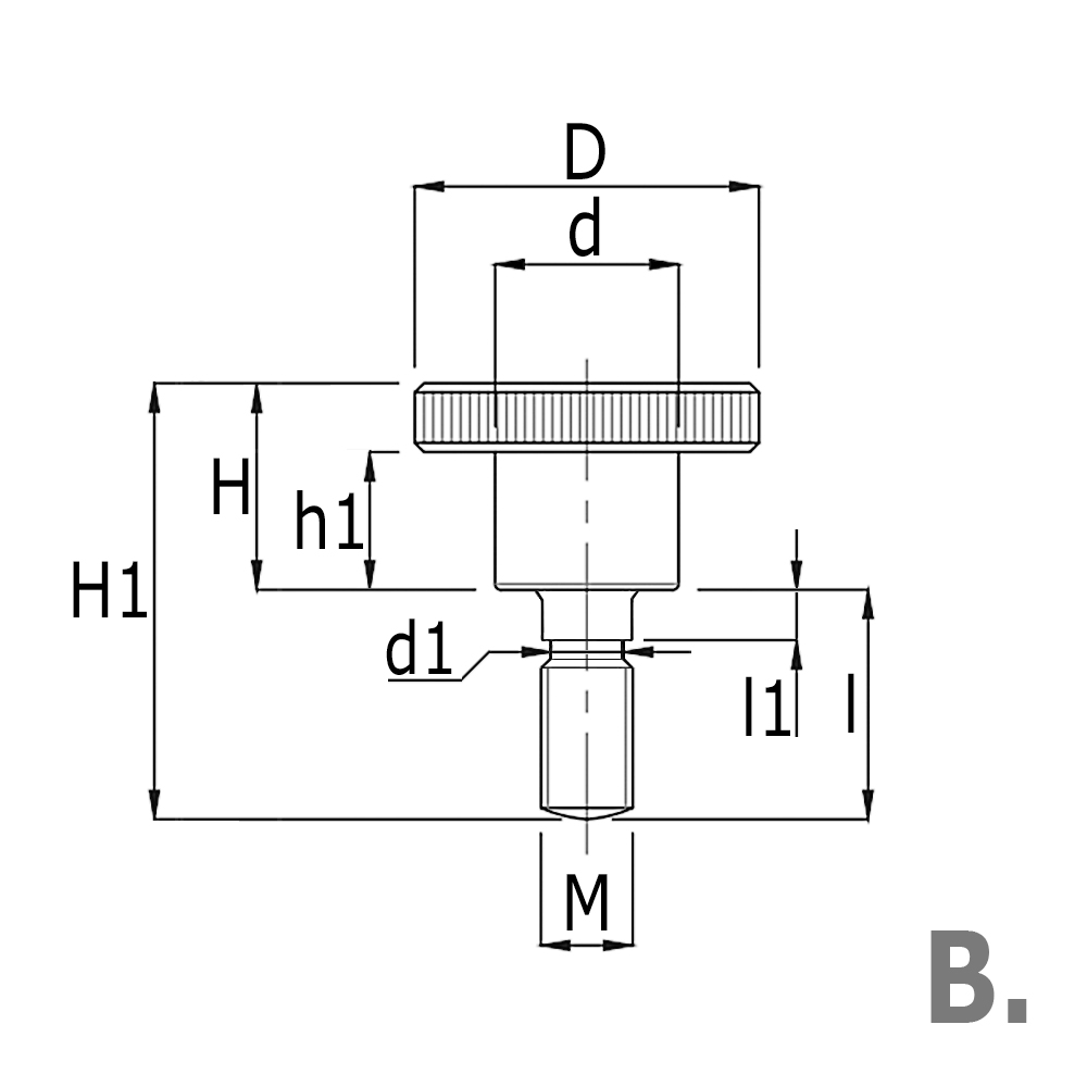 D=Ø-bouton, D=Ø-épaulement, H=Hauteur du bouton, H1=Hauteur totale , h1=Hauteur d'épaulement, l=longueur du filetage, M=Filetage