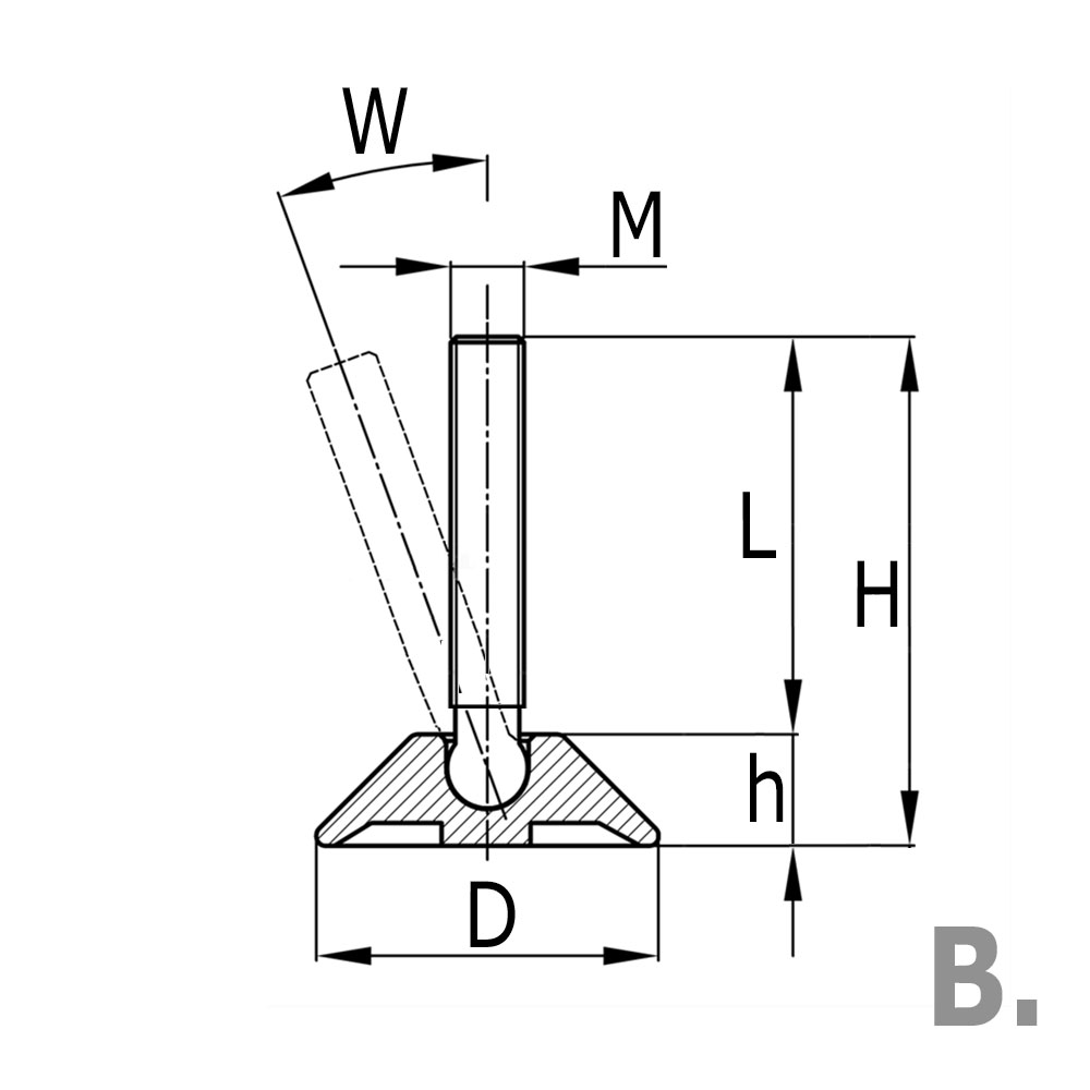 D=Ø-pied, H=Hauteur, H1=Hauteur jusqu'à partie supérieure hexagonal, L=Longueur du filetage, M=Filetage, SW=Sur plat, Type=Exécution, W=Angle de montage maximale en °
