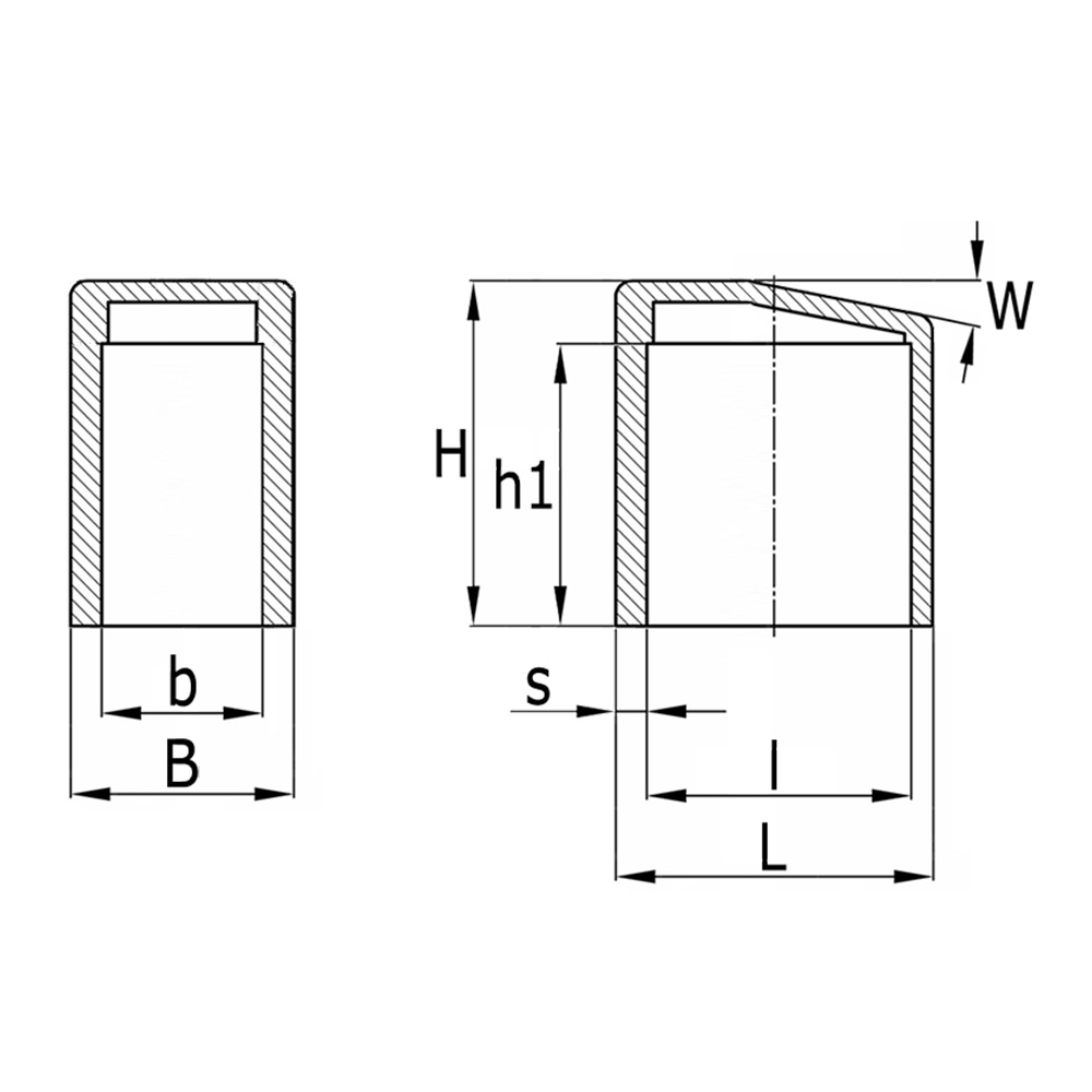 LxB=Dimension extérieure embout, Dimension du tube=Dimension du tube hors tout, l1xb1=Dimension embout intérieure, d=Épaisseur de paroi, H=Hauteur, T=Profondeur, W=Angle de positionnement en °