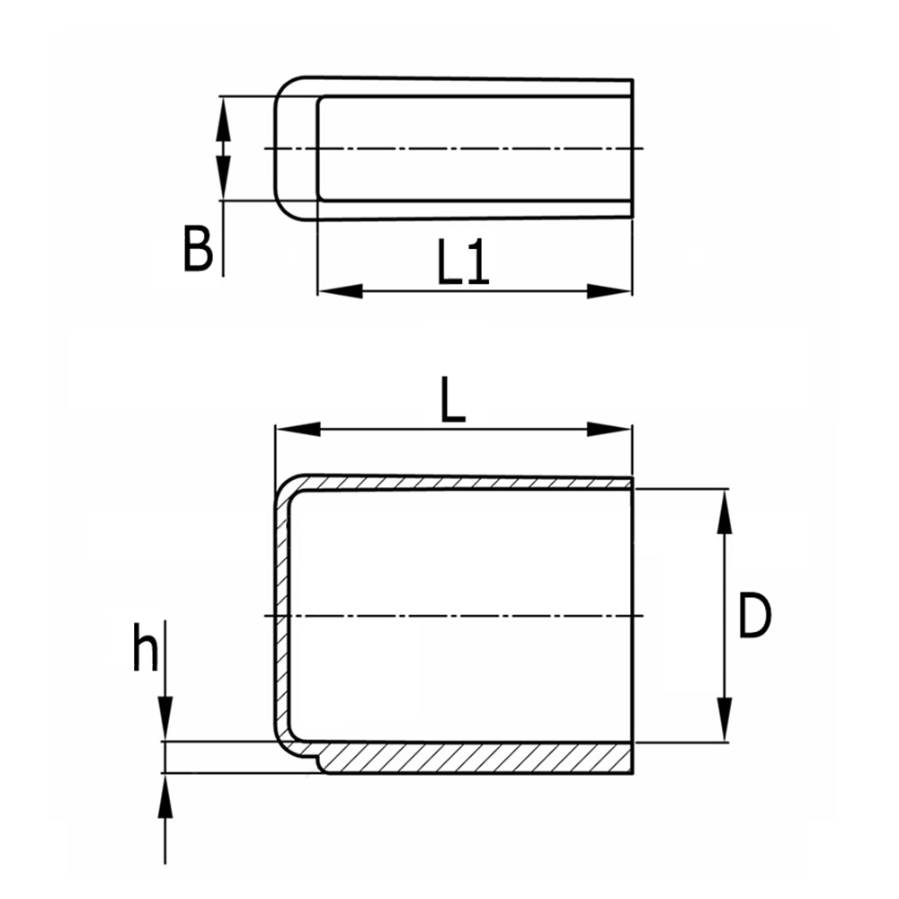 B=Largeur intérieur, Dimension du tube=Dimensions des tubes extérieur , D=Intérieur hauteur, h=Épaisseur pied, L=Longeur, L1=Longeur intérieur