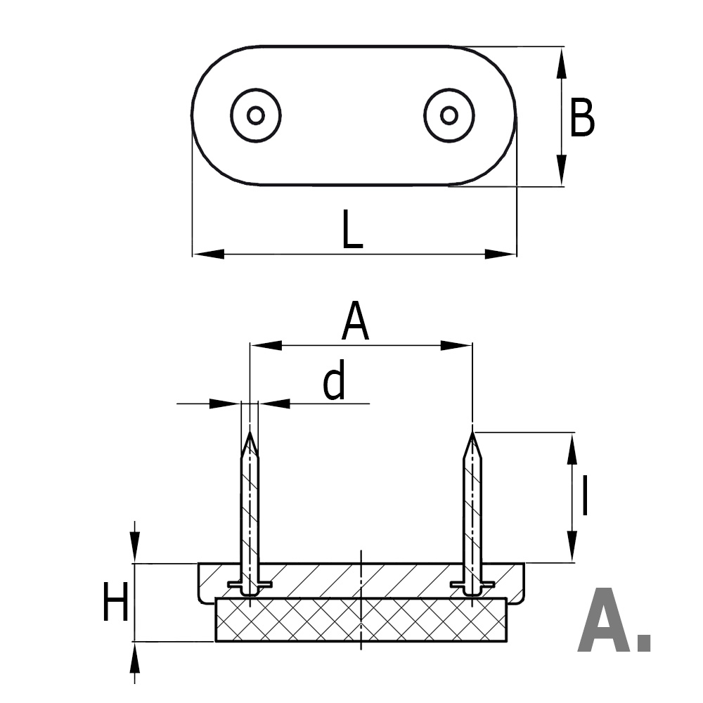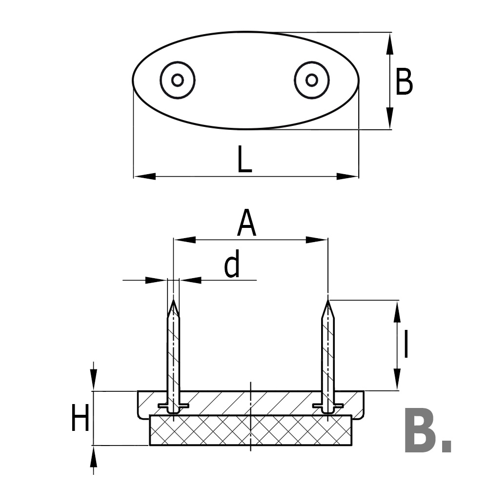 A=Entraxe clous, B=Largeur pied, D=Ø-clou, H=Épaisseur pied, L=Longeur pied, l=Longeur clou