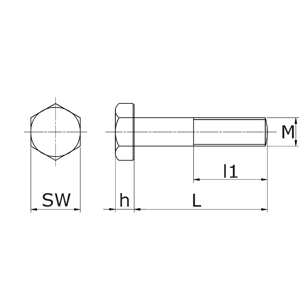 h=Hauteur tête, l=Longueur boulon, l1=Longueur filetage, M=Filetage, SW=Ouverture de clé en mm
