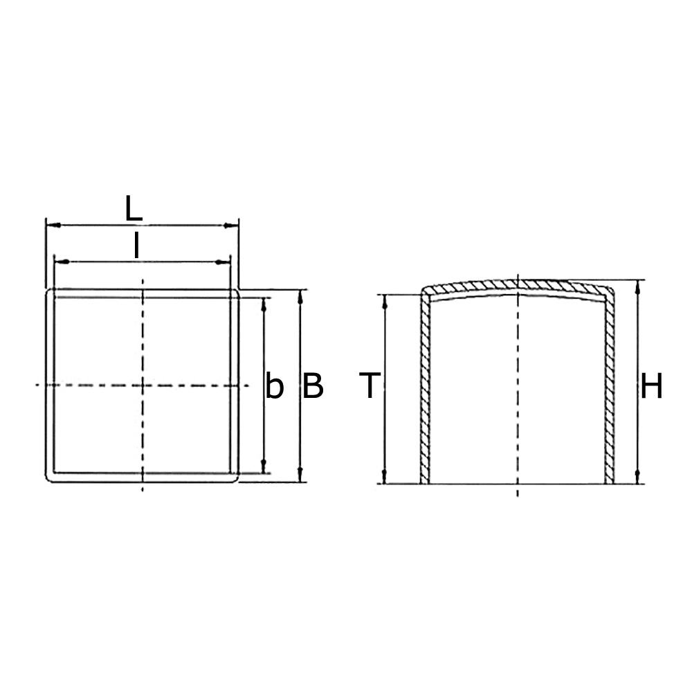 LxB=Dimensions bouchon extérieures, Dim. tuyau=Dimensions tube extérieures, lxb=Dimensions intérieures, H=Hauteur totale, T=Profondeur