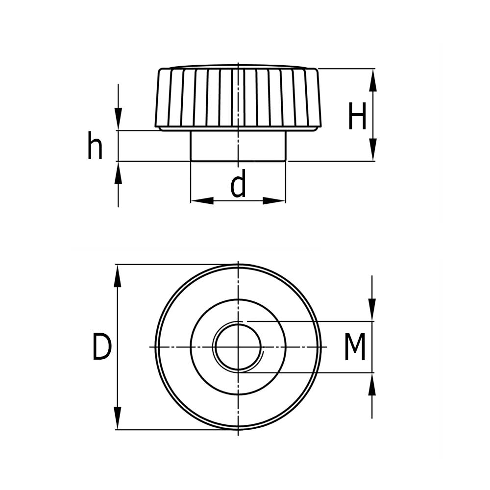D=Ø-bouton, D=Ø-tige, h=Hauteur du bouton, h1=Hauteur de tige, M=Filetage