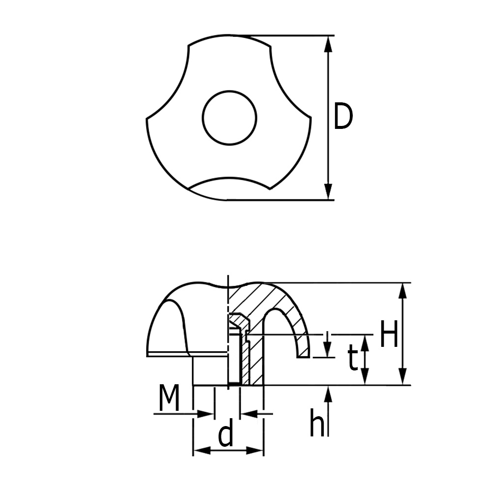 D=Ø-bouton, D=Ø-moyeu, H=Hauteur, h=Hauteur, M=Filetage, T=Longeur douille filetée