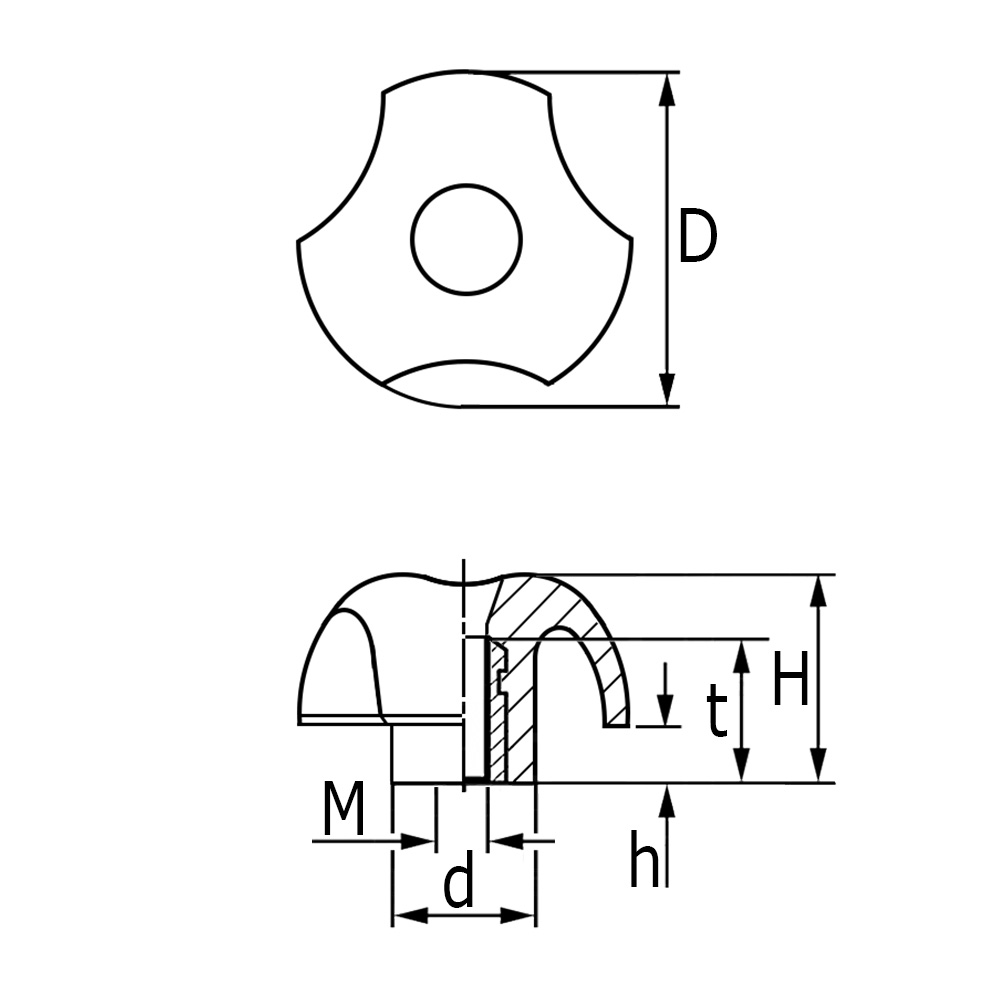 D=Ø-bouton, D=Ø-moyeu, H=Hauteur, h=Hauteur, M=Filetage, T=Longeur douille filetée