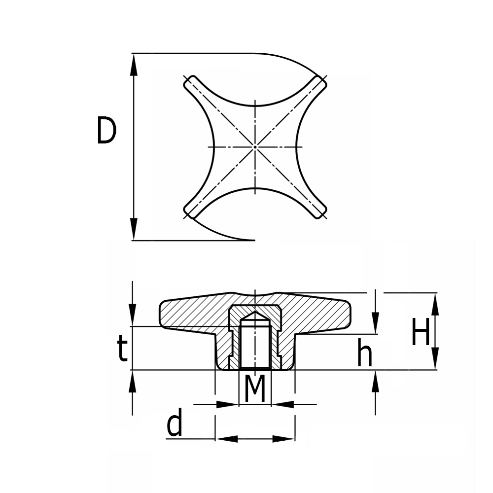 Poignée en croix en bakélite DIN 6335 avec filetage femelle