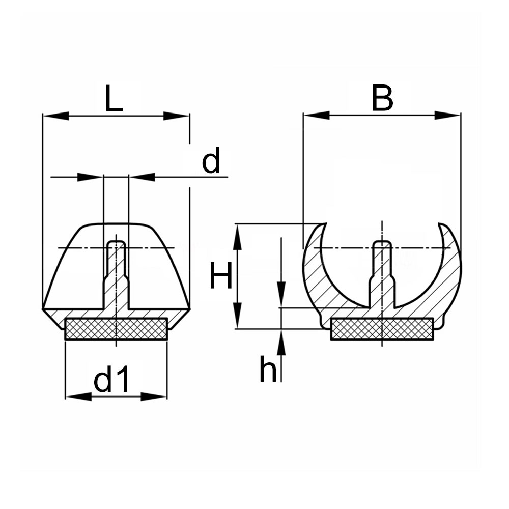 B=Largeur, Perçage =Dimension de perçage en cadre tubulaire, Dimension du tube=Ø-tube extérieur, D=Ø-tige, D1=Ø-disque en Téflon, H=Hauteur, h=Épaisseur pied, L=Longeur