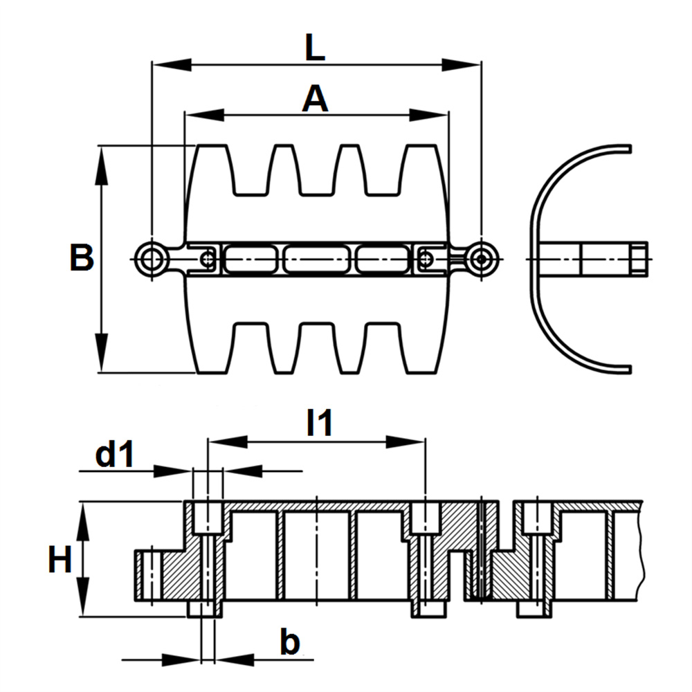 Quantité=Quantité éléments, A=Longeur, B=Largeur, B=Ø-perçage, D1=Ø-trou galvanisé , H=Hauteur, L=Longeur raccords entraxe, Exécution=Longeur set en mm